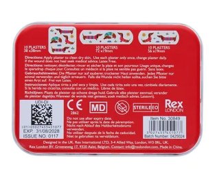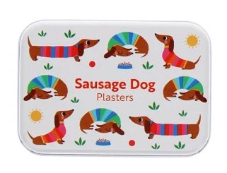 Lille metalæske med 30 styk latex-fri gravhundeplastre i forskellige størrelser.